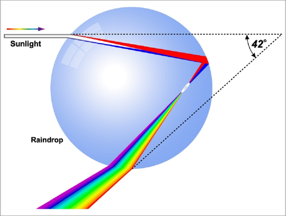 在折射现象里面,刚才提到的所有的光都是单色光,但如果要是一个白色的光或者是复色光通过棱镜的时候,我们发现不同的颜色的光在棱镜中的折射率是不一样的。也就是说他们传播的速度不同,从而导致我们看到的现象,称为光的色散。可以看到,白色的光可以通过棱镜变成彩色的,而这种现象,如果说不是棱镜而是一个球呢?光进入这个球的时候,形成了一次色散,然后在球的对面,反射过来的光再经过球的另外一个出口形成二次色散,通过这两次色散的结果可以把白色的光分成彩色的,这是通常能够观察到彩虹的基本物理原因。另外一个问题就是折射的问题,刚才说鱼在水里面能看到人的问题,也就是说如果将光从光密介质传输到光疏介质的时候,折射角是大于入射角的,我们可以看到随着入射角的逐渐变大,折射角越来越大,直到大到90度的时候,形成一个所谓的临界角,在临界角下就没有光透过这个界面,如果再继续增大,那么这时光都会在介质2中形成完全的反射。