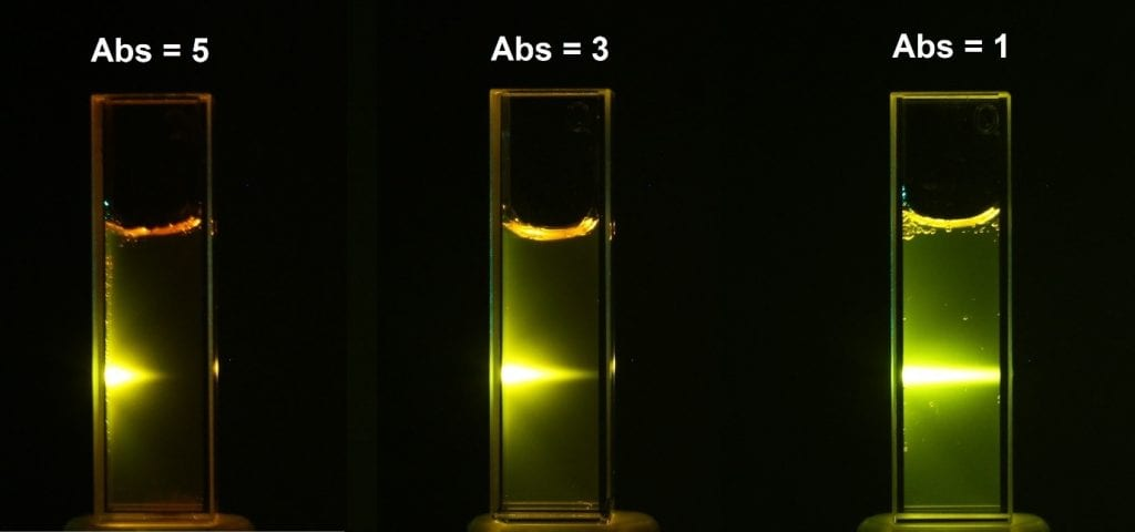 另外一个问题就是光的吸收,光的吸收就是使光通过材料的时候与材料发生相互作用,电磁辐射的能量被部分或者是全部转为其它能量的物理过程。当把一束光打在这个介质上,会发现传输的能量除以输入的能量,我们通常称为透射,如果把总能量除以透射的能量,可以得到一个所谓的吸收系数。可以看到在这个里面,如果吸收系数越大,光的穿透能力就越弱。可以看到,当吸收系数在5的时候,光基本传不过去,如果吸收系数是1,光就能比较轻松的传过去。