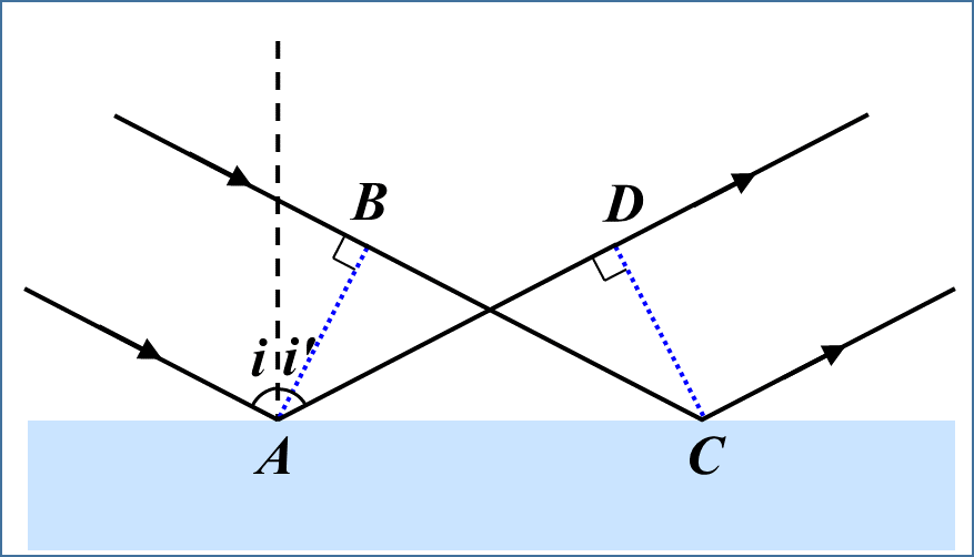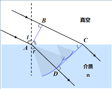 下面我们讨论的是光的反射。光的反射其实非常简单,通过一束光打在一个镜面上的时候我们会看到它的反射光。通常我们考虑到的反射定律是反射光的反射角等于入射角。这个结果可以通过特别简单的惠更斯原理来解释:球形波面上的每一点都可以是一个次级的球面的子波源,而且子波源的波速与频率都等于原来的波速和频率,而子波源波面的包络是形成后面发射的波面。所以如果我们用这个原理证明反射定律的话,我们会看到,在这样一个结果里面,如果B到C的距离和A到D的距离是相等的,通过这两个直角三角形很轻松地可以得出它的入射角的大小是等于反射角的。