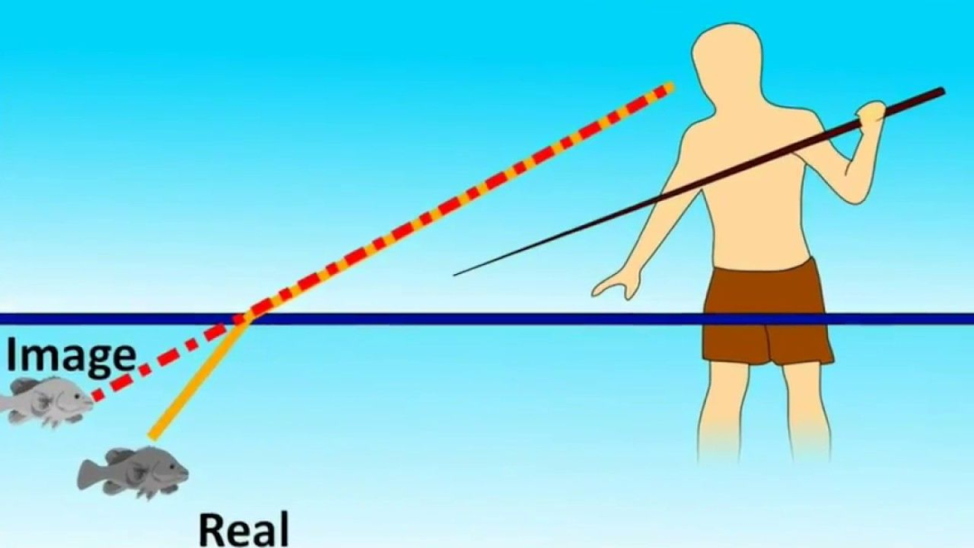可以举一个简单直接的例子,在看见水里的鱼的时候,看到的实际的位置是比鱼的真实位置要高的,其实就是离水和空气的介面要近,我们要用鱼叉插鱼的时候,要瞄准的是鱼的身子下面而不是鱼,因为那才是真实的鱼的位置。也就是说,我们通过眼睛看水中物体的时候,物体总是抬高的,反过来,如果在水中看岸上物体的时候,我们会发现,比如岸上物体比实际物体要高的。开玩笑说为什么我们都是人去打鱼而鱼没有要咬人,就是因为它看到我们人太高大了,而它也没有机会伸出水面来看看人究竟有多高。