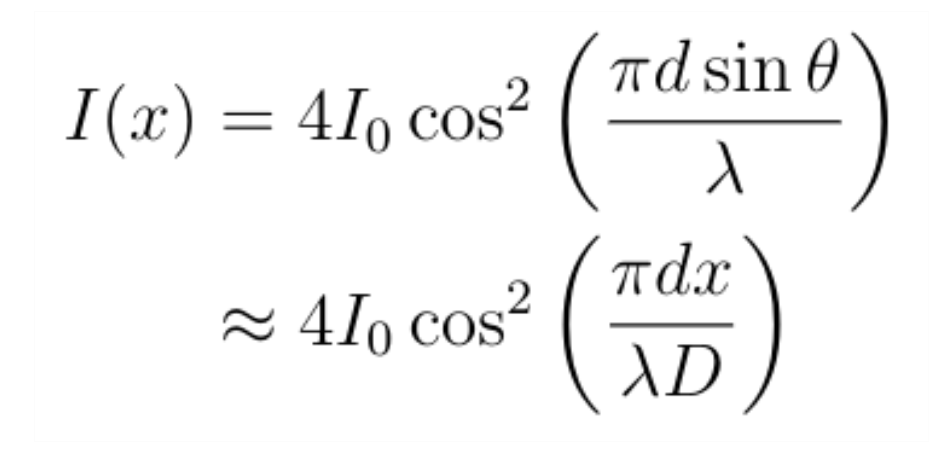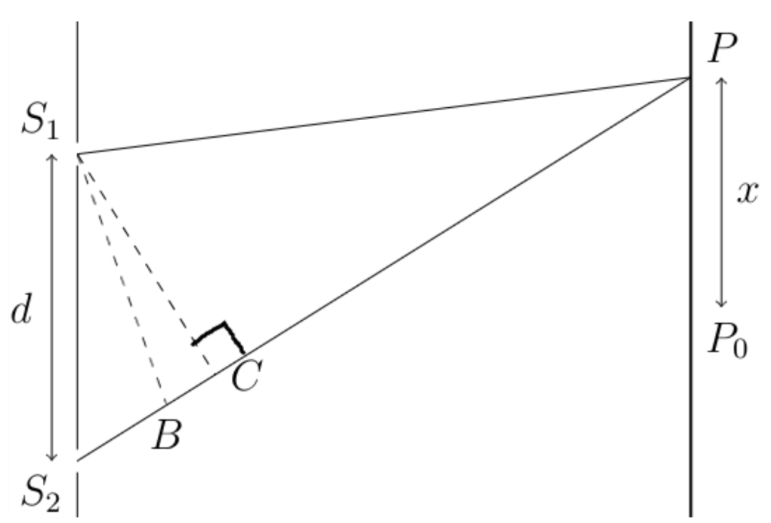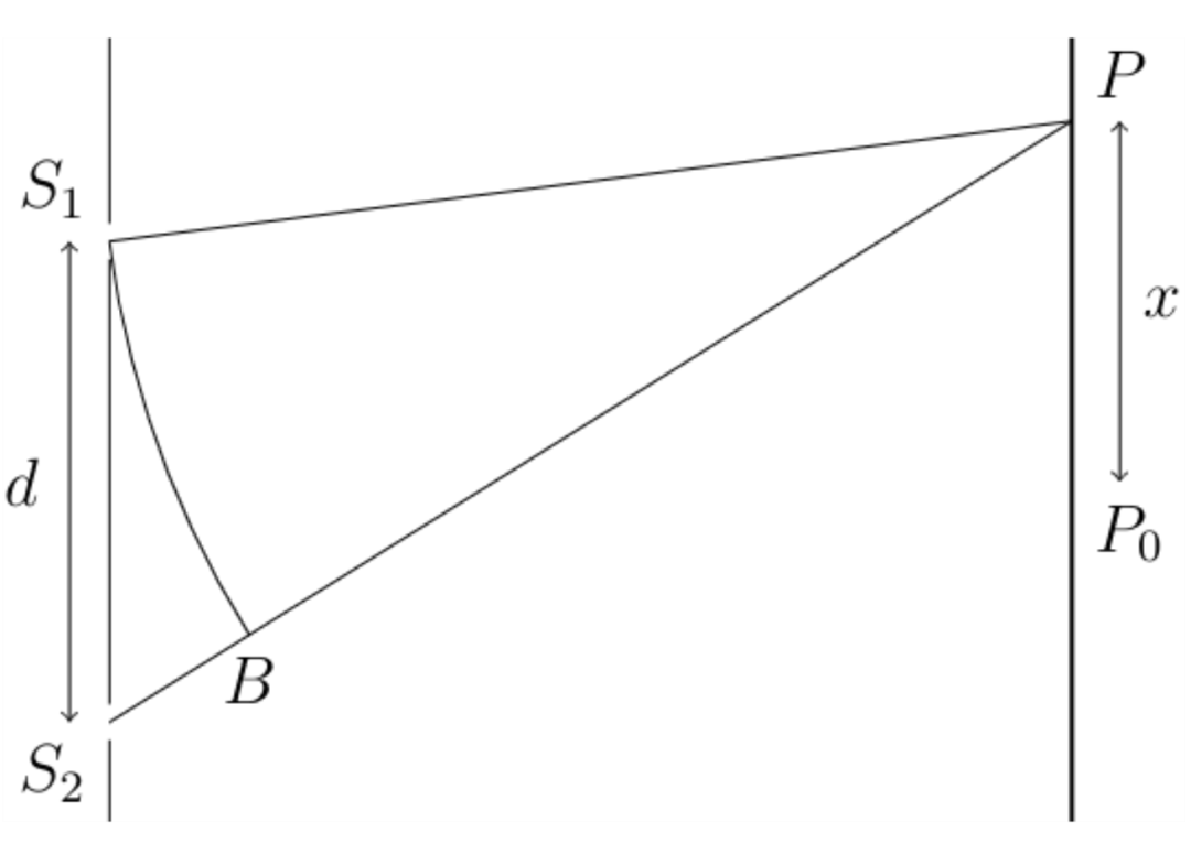 显然,从 S₁ 和 S₂ 发射的波不是光束,但是由于我们仅考虑某一个点上的强度,因此我们可以把它们看作光束。又因为两个狭缝到P点距离不同,所以振幅不会完全相等,但是由于距离差别很小,因此可以将两个光束近似地视为在P处具有相同的振幅I₀。如果用这种方法计算得到的下列函数可以给出图中暗点的位置,那么就说明光是波: