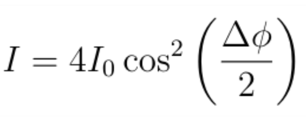 光波从S₁传播到P所需的时间为t₁= |S₁P| / c,因此,如果这束光的角频率为ω,则到达P时产生的相位为ω|S₁P| / c,并且由于从 S₂ 到C的距离是dsinθ,这意味着来自 S₂ 的光波到达P时的相位为(ω/ c)(|S₁P| +dsinθ),因此两束光在P处的相位差为Δϕ =(ωd/ c)sinθ= (2π/λ)dsinθ。现在,我们需要进一步的论证来得到P处的亮度。事实证明,同一点上两束相干光束亮度由下式给出: