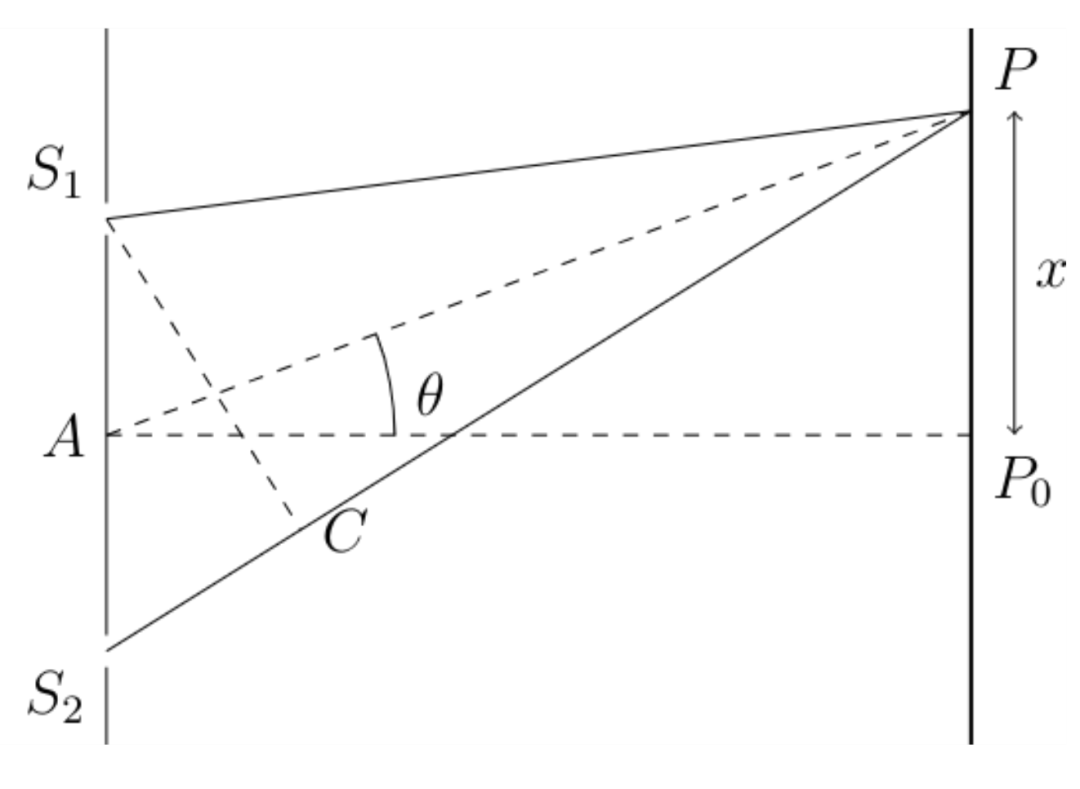 我们通过考虑两条路径 S₁P 和 S₂P 的长度差(我们称之为 ΔL)来实现这一点。同时假设挡光屏到接光屏的距离D远大于x和狭缝间距d。角度 θ 是三角形 P₀AP 中角 A 的大小。