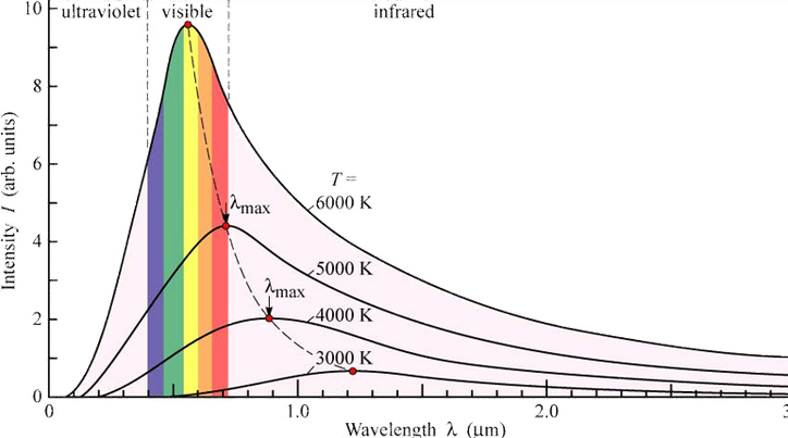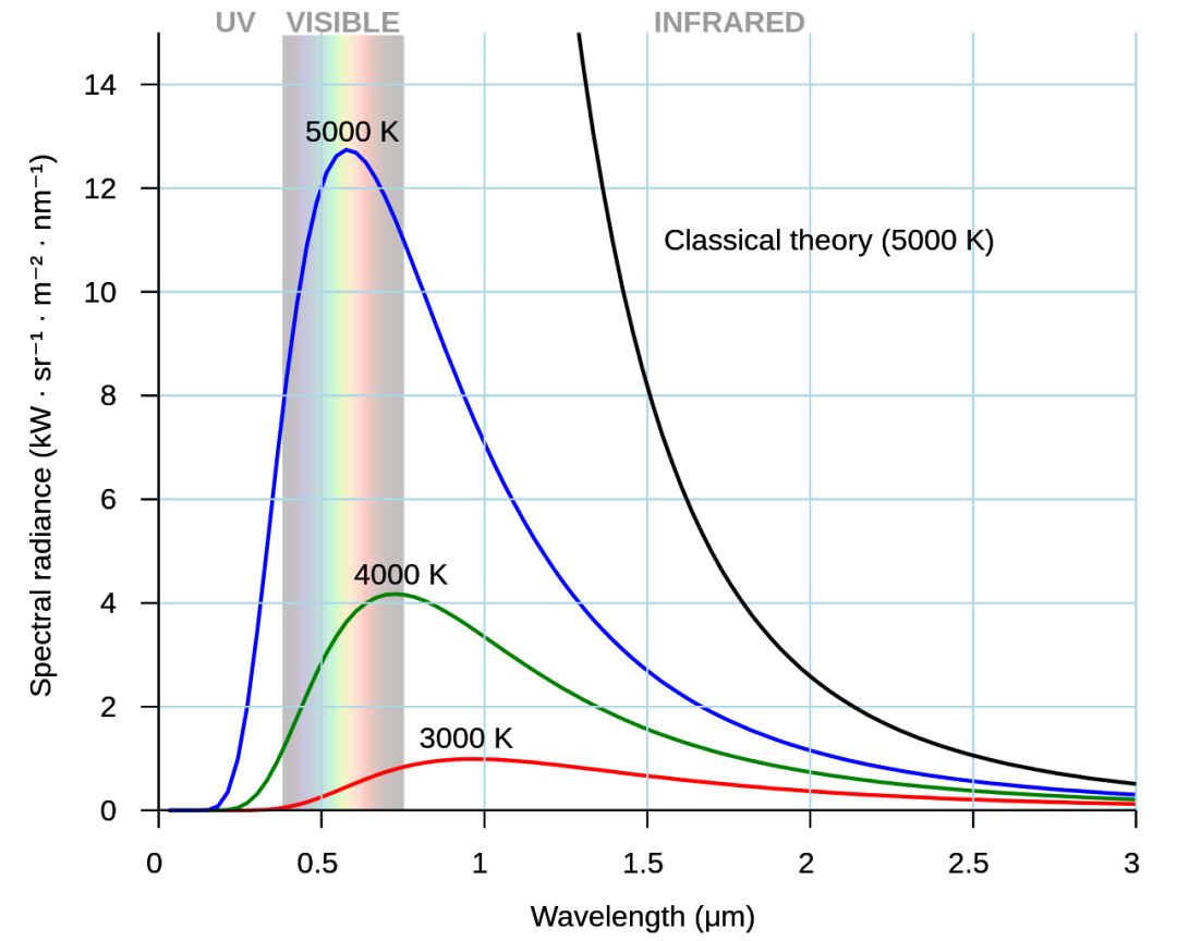温度高于绝对零度的任何物体都会因热辐射而损失能量,这种辐射被称为黑体辐射。黑体是不反射任何入射辐射的理想物体,因此从黑体上检测到的任何辐射都必然是热辐射。当人们测量黑体辐射的频谱时,结果如下图所示: