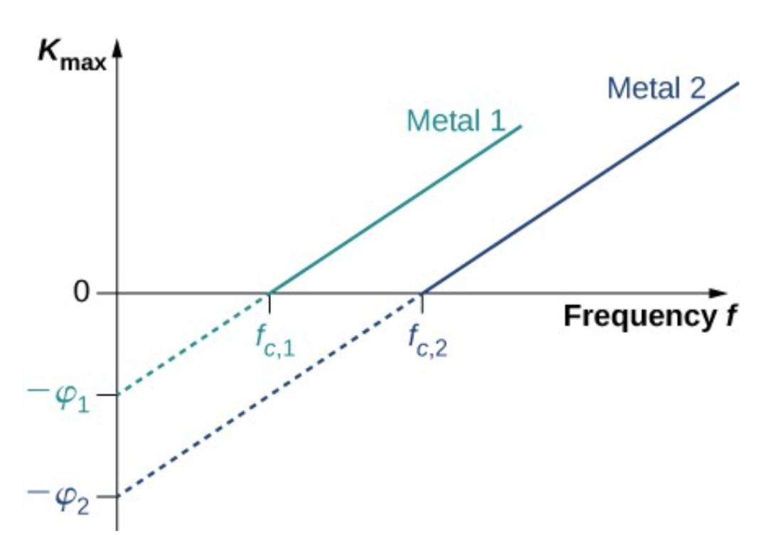 通过对数据的拟合可以得到公式 K=hf-φ,其中h普朗克常数, φ 被称作金属的功函数。