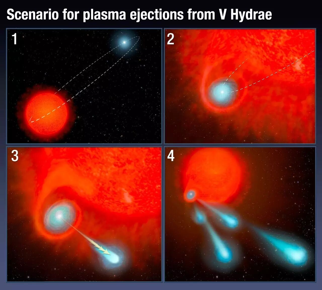 上述四张图片展示了双星系统V Hydrae发射球状等离子气体团到外太空的过程。第一张图片展示的是两颗恒星彼此环绕轨道运行。其中一颗恒星(主星)快走到生命的尽头,已经开始膨胀成红巨星。在第二张图片中,较小那颗恒星(伴星)按其天体轨道运行已进入红巨星的大气层。在此过程中,伴星将吸收红巨星的物质并在伴星周围形成圆盘。如第三张图片所示,当吸收的物质达到阈值时,这些炙热的等离子体气团将沿伴星的旋转轴线向外喷射。如图四所示,这种喷射过程每8年重复一次,在此期间伴星环绕着轨道运行直到再次穿过红巨星的膨胀外层。