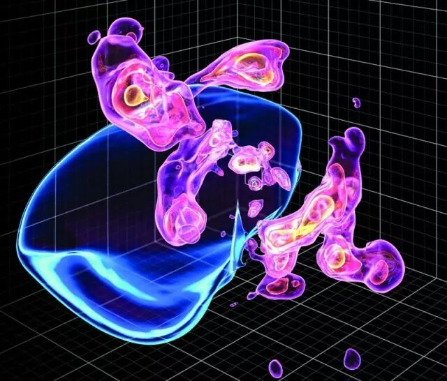 绘制拉尼亚凯亚超星系团(图中蓝色结构):整体来考虑的话,星系的位置和运动或是随宇宙膨胀而发散的,或是受到引力作用而聚拢。在引力的聚拢作用开始严重阻碍宇宙膨胀导致的发散运动的位置,就可以画下超星系团的边界。我们在这里绘出了超过8000个星系的位置,并且用颜色来表示它们的相对运动 (同时考虑了聚拢和发散运动时的速度和轨迹)。暖色调(黄色和粉色)的轮廓线代表星系团快速地聚拢到一起。拉尼亚凯亚的轮廓线用的是冷色调的蓝色,勾画出了星系团聚拢最慢的位置。拉尼亚凯亚横跨将近5亿光年,在这范围内的星系团如果没有宇宙膨胀的影响的话,将会聚集成单个引力束缚结构。在拉尼亚凯亚边界之外我们可以看到沙普利、武仙、英仙-双鱼超星系团以及其他邻近的超星系团。图片来源:《环球科学》