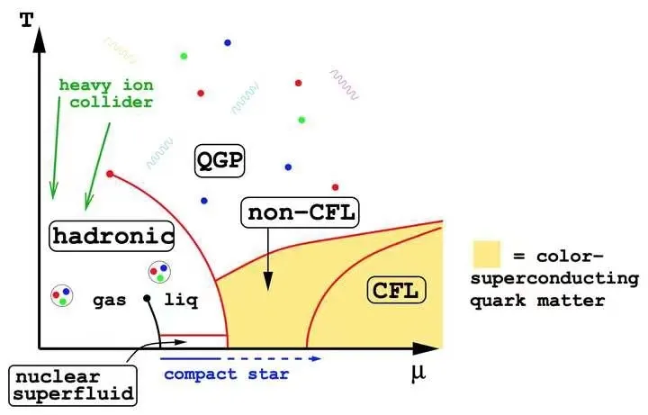3、强核力对应规范场论。强子由夸克构成,夸克间的强相互作用由规范作用来实现,群也是非阿贝尔群。