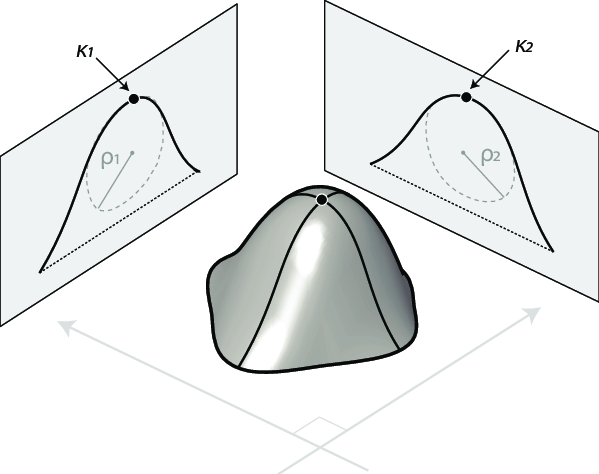 首先,稍微介绍一点什么是平均曲率。审视曲面弯曲形状的方式是化面为线。把曲面截开,截面上的曲面就是一根一根的曲线,简称截线。不过截的时候,要沿法线截下去。一个二维曲面,可以找出正交的两根截线(法截线),用这两根截线的曲率(主曲率)来标志曲面的弯曲程度,参考图7。