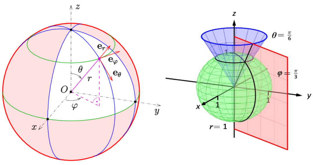 图8  球面坐标。r 为常数时,为一个半径为 r 球面,平均曲率为 1/ r 。 θ为常数时,为一个锥面,平均曲率为 cot θ/2 。 φ 为常数时,为一个平面,平均曲率为零。(图取自网络后编辑而成)