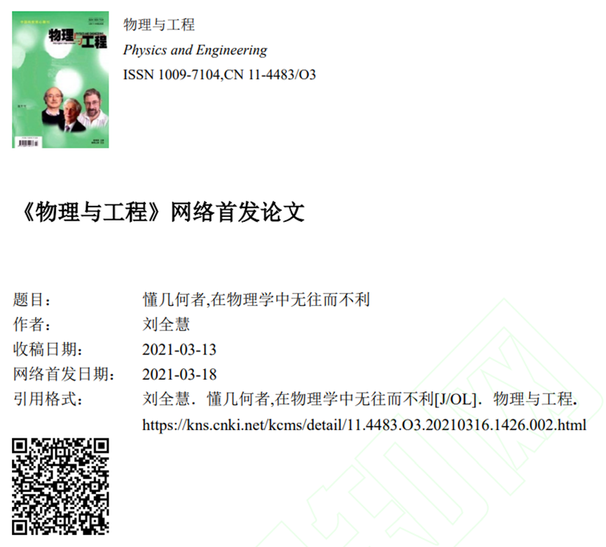 最近有篇小论文,从投出到刊出的时间,五天,创下了中国 (也许国际上) 学术刊物发文章速度的最快历史纪录。这就是《物理与工程》(教育部高等学校大学物理课程教学指导委员会学术刊物,清华大学编辑出版)上的拙作《懂几何者,在物理学中无往而不利》。2021年3月13日收到,18日上线。这篇文章,既不是投稿,也不是约稿,而是《物理与工程》编辑部和笔者商量为他们的微信公众号写篇一篇文章,文章草成后,编辑部认为是“好文章”然后“升舱”到刊物上的结果。炮制这篇文章只用了两天,但是积累素材却持续了20来年,内容作为腹稿也孕育了一段时间。同一时间段内,投给《大学物理》的一篇文章《几何视角下的热力学》也受到好评,编辑部将安排在某一期的首篇推出。