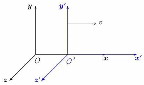 假设我们在地面系S建立了一个坐标系(x,y,z,t),现在有一辆火车以速度v沿x轴正方向匀速运动。我们在火车系S’里也建一个坐标系(x’,y’,z’,t’),为了简化问题,我们让这两个坐标系一开始是重合的。