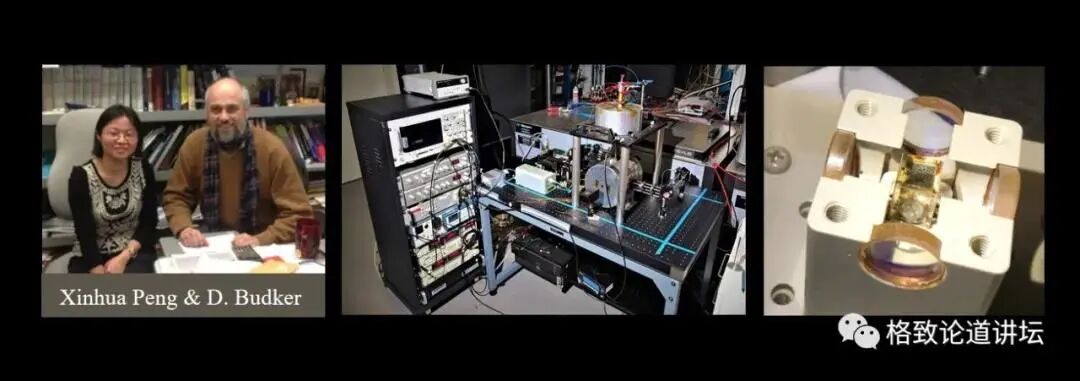 下图中间这台谱仪是我们最近开发的一台零场核磁共振谱仪。这是我们研究组和美国的加州大学伯克利分校的D. Budker教授(图左)共同研发的成果。在这个装置里面最重要的一个器件,就是下图右边展示的原子磁力仪
