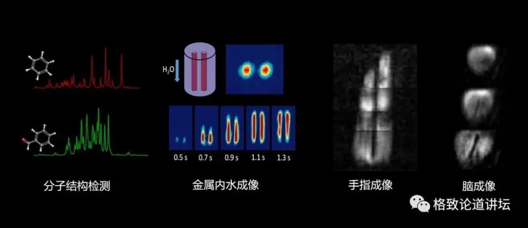 此外,这里还展示了从一个从分子到金属,然后到人体组织的零场核磁共振,如右边两张图展示的手指和人脑的成像。尽管现在成像的清晰程度还不如传统的磁共振成像,但是它没有强磁场、更安全,而且还有一个很大的优势,就是很便宜、成本很低。如果未来能够进入到医院的话,就会大大地降低医疗成本,所以它的应用前景是非常广泛的。