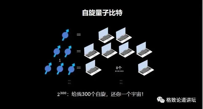 这种增长的方式大家可能还没有一个直观的概念。举个例子:大家可以把一张纸对折,如果对折30次就是2的30次方。2的30次方能够达到多高呢?可以达到珠穆朗玛峰的海拔高度。如果你对折50次,厚度就能够达到太阳与地球之间的距离了。如果有300个自旋比特,即2的300次方,那就比我们整个宇宙中所有的原子加起来的总和还要多