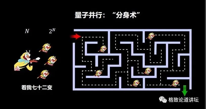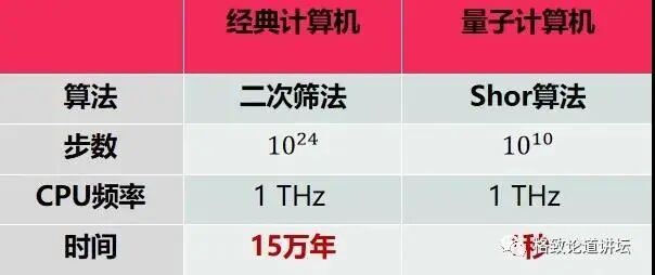 这里大家可以看出,经典计算机需要15万年时间才能解决的问题,一台量子计算机1秒钟就能够解决了。