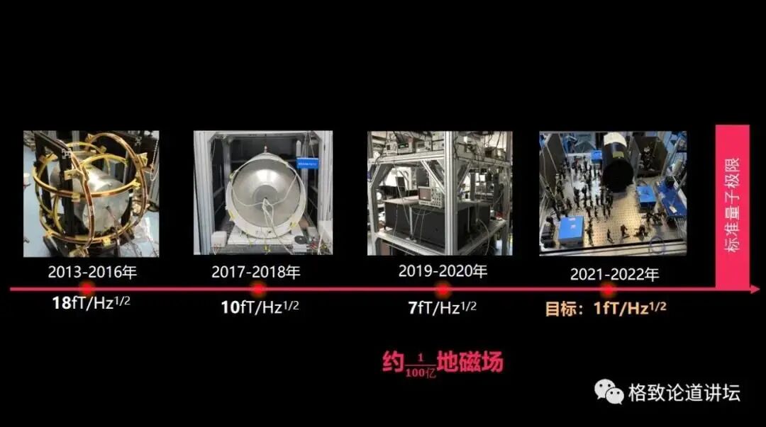 在这个方面,我们研究组经过了近十年的努力,研制了若干代的自旋磁力仪,我们对磁场的探测能力也在不断地提升。