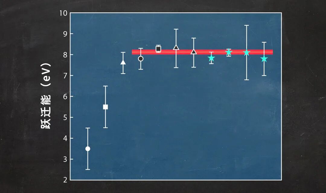 自1994年起发表的钍-229能值,不同形状标识代表不同研究,最后四组(星标)即为最新研究得到的新数据。红色粗线代表着最近8次测量的加权均值,大约为8.12±0.11eV,相当于152.7±2.1 nm的波长。| 图片来源:L. von der Wense/JILA; adapted by APS/Alan Stonebraker