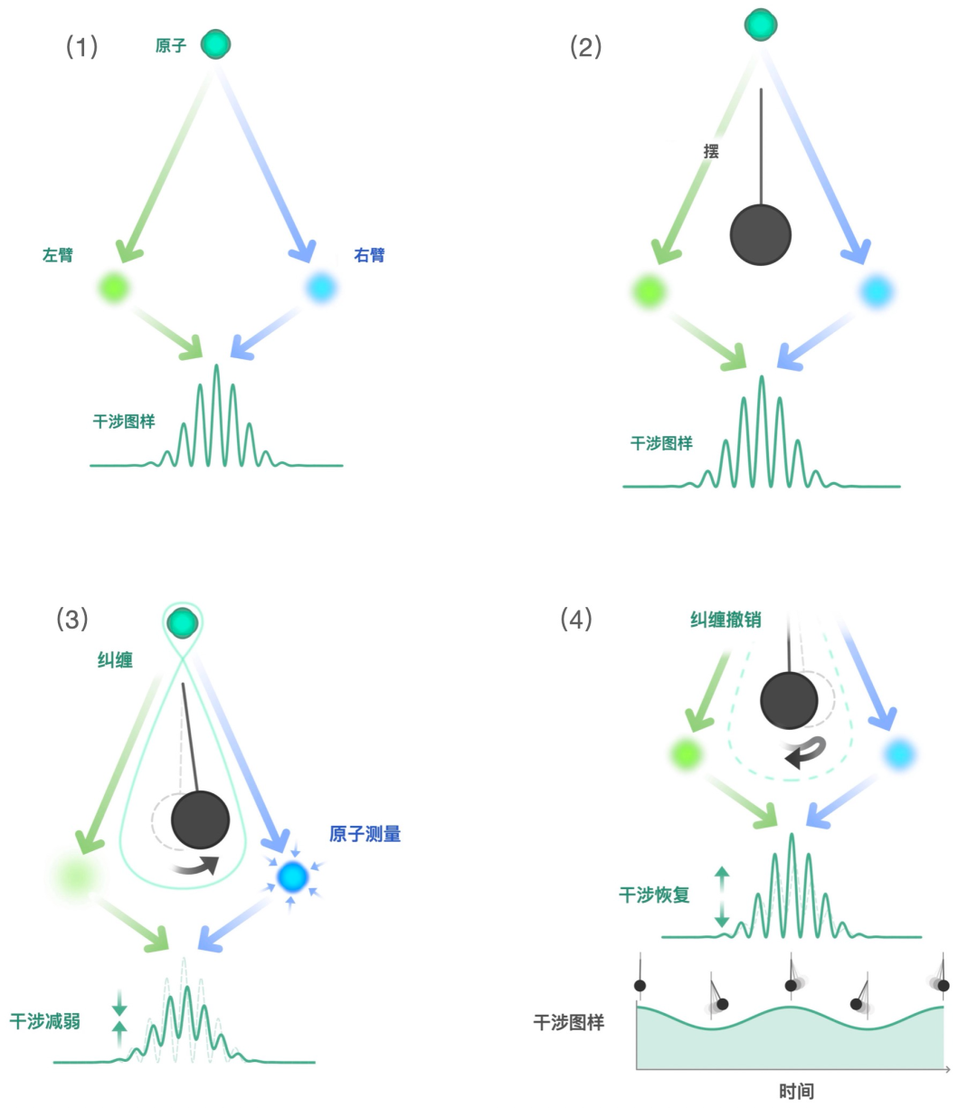 位置的纠缠意味着摆已经有效地对原子的位置进行了测量,将原子精确地定位到干涉仪中的一个特定位置。由于原子不再处于同时处在两个臂中的叠加状态,干涉图样就会消失或者减弱。