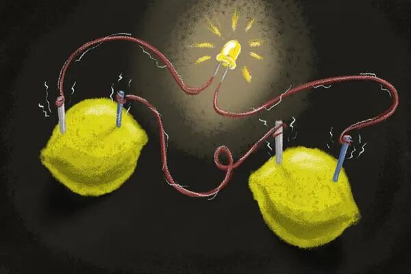 早在1800年,历史上第一个电池就被亚历山德罗·伏特(Alessandro Volta)发明了出来。它由几组电池串联而成,可以形象地看作是电池组的堆叠,而被称为“伏打电堆”。这项发明奠定了电池结构的基础——两个电极、电解质,再加上连接两个电极的外电路。而我们熟悉的一个化学实验——水果电池,就是模拟了最原始的伏打电堆:将锌片和铜片当作两个电极插入一个柠檬中,以柠檬中的酸为电解质,外加连接小灯的导线,我们就能看到灯变亮,对应着水果电池的放电。