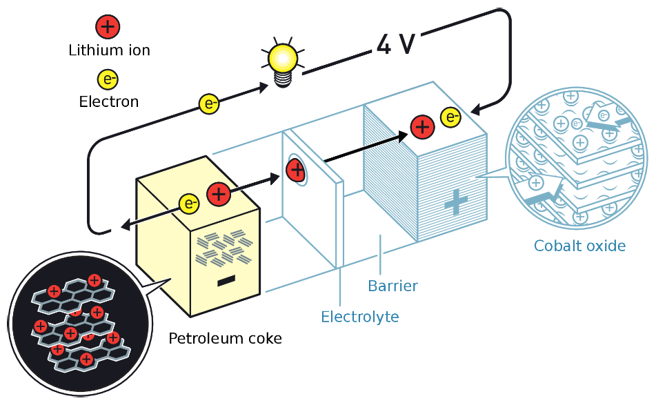 自1980年起,就以古迪纳夫发现的钴酸锂为基础,通过替换钴元素,或掺杂镍、铝、镁、锰、铁等金属元素,演变出了多种锂离子电池的阴极材料。在20世纪80年代,作为锂离子电池阳极的材料也被报道出来——1983年,Richard Yazami博士证明了具有层状结构的石墨能够可逆地嵌入、脱嵌Li+。在锂离子电池中,放电时,Li+会从石墨阳极脱嵌,穿过电解质嵌入钴酸锂中,而充电时,Li+会从钴酸锂阴极中脱嵌,穿过电解质后再嵌入作为阳极的石墨层间。这种电池也被形象地称为“摇椅电池”(rocking chair battery)。
