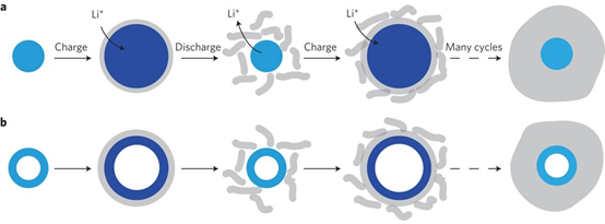但是,Si作为阳极存在一个致命的缺陷——它在完全嵌锂的状态下,其体积会膨胀到原有体积的300%。如果随着充放电,Si阳极连续地膨胀、收缩,最终整个阳极会破碎甚至完全损坏。