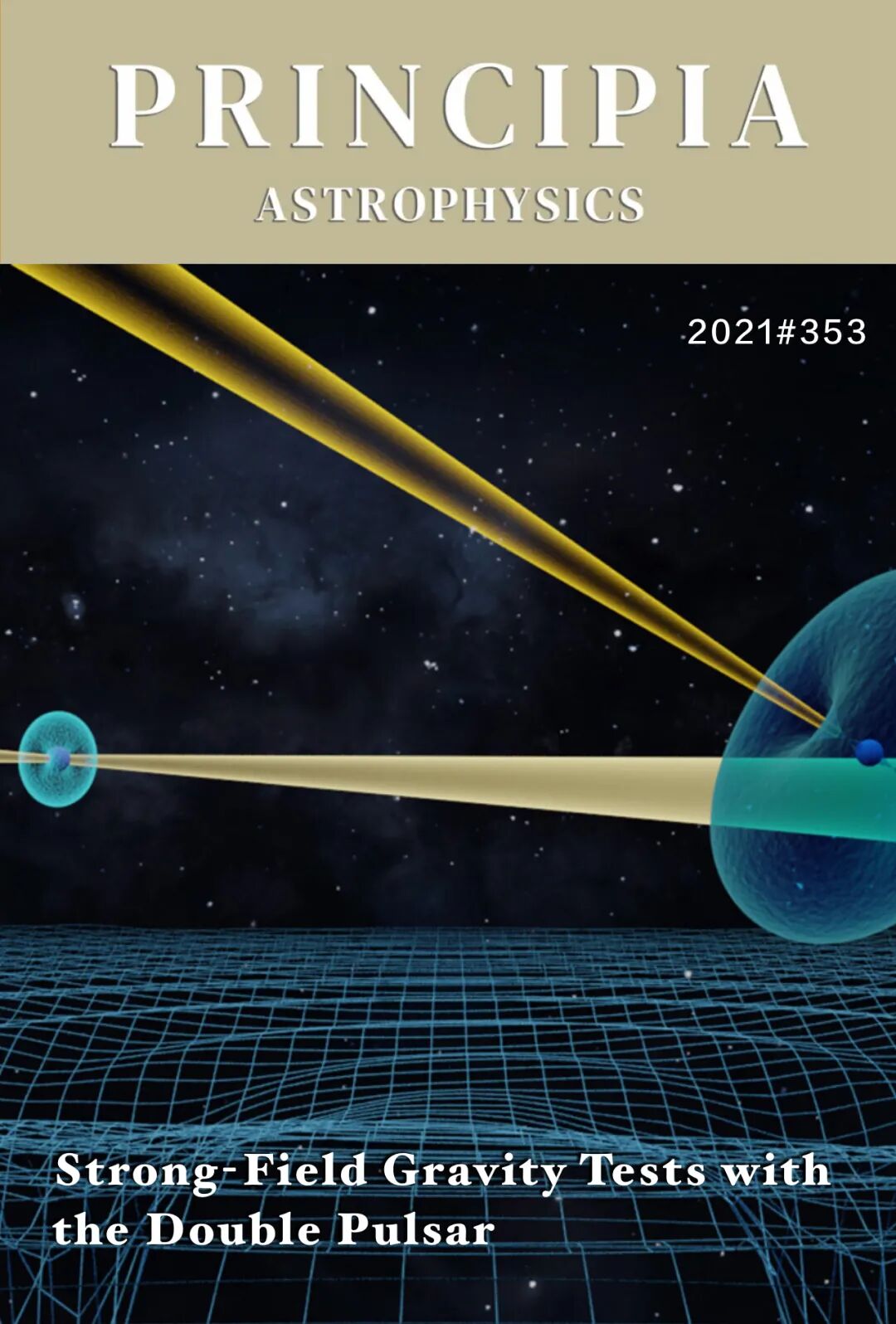 两颗彼此围绕的脉冲星(蓝色圆圈)所发出的辐射束(黄色光束)受强磁场(浅蓝色甜甜圈装物)引导。这两颗脉冲星揭示了由脉冲星引起的时空扭曲效应(蓝色网格),验证了爱因斯坦的广义相对论。|图片来源:M. Kramer / Max Planck Institute for Radio Astronomy