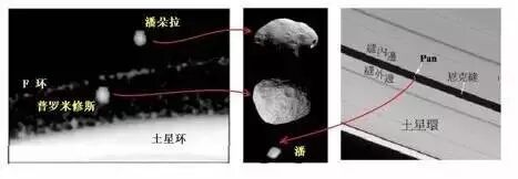 由上所述,普罗米修斯和潘朵拉“一内一外”守护着F环中的“羊群”,还有另一个有趣的卫星“潘”(pan,土卫十八),则守卫着一条缝(恩克缝),见图9b。