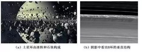 然而,你要是坐在卡西尼号上,真正在近处把土星美丽的光环仔细看了个一清二楚的话,心中的童话世界可能要破灭了!那个看起来细薄如光碟、飘渺如轻纱般的“环”,原来是由大量冷冰冰硬邦邦的尘埃、冰粒和石块组成的,近距离看来,似乎毫无美丽浪漫可言(图2a),并且,在太空中飘荡的卡西尼号还得小心,防止被这些大石块“砸死”。