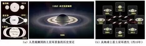 如图1b所示,当环面比较“正面”地朝着地球,人类看到圆盘的大部分,当环面侧面对地球的时候,从地球上看起来是一条线,伽利略望远镜的分辨率不够高,将正环面都看成了“耳朵”,当然更不可能看见这条细线,所以产生了“耳朵消失又回来”的错觉。土星绕着太阳公转的周期是29.45年,其中有两次侧对地球,因此,地球观察者观测到土星环形状变化的周期,大约是15年左右。