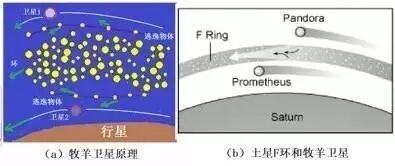 换言之,行星环看起来“稳定”的形态是与离它不远的某些卫星的运动有关的。天文学家将此类卫星叫做“守护卫星”,或“牧羊卫星”。它们充当着“环场指挥”的角色,像是放牧时奔跑于羊群周围负责警卫的牧羊犬,又像是带领一群孩子到野外郊游时维持次序避免小孩丢失的幼儿园老师。当环中某个“不守规矩”的物体企图冲到“环”外时,“牧羊卫星”可以利用自身的、相对而言较大的引力,将这个“顽皮分子”拉回到队伍中!