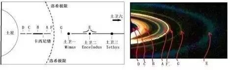 因此,大多数的行星环都在洛希极限以内,但并非绝对的,还与行星环形成的历史过程有关。比如,从图3中标志的洛希极限的位置,土星的G环和E环都在洛希极限圈之外。