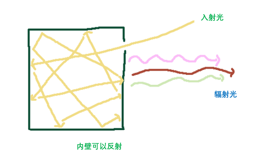 想象一只做得非常严丝合缝、一点光都透不出来的盒子。盒子的内可以对光有完全的反射,就像贴满了非常明亮的镜片。想象到了吗?好,现在在盒子的一边戳一个小洞,让能量可以通过小孔进入盒子,等待能量逐渐流入。最终,系统会稳定在一个叫做“热平衡”的状态。这是什么意思呢?就是说能量在整个盒子里是均匀分布的。在这样一个结构中,盒子会“做”两件事情:首先,它会从整个电磁波谱中吸收光;其次,它也会发射各种频率的光。这种结构就叫做黑体