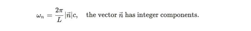 电磁波会在黑体内壁之间来回反射。经典理论告诉我们,这些电磁波必须遵循麦克斯韦方程组。这个长方体盒子的六个面构成了 x 、 y 、z 方向上的三组边界,麦克斯韦方程组规定了边界条件,对光的频率 ω 做出了限制。并不是所有频率的电磁波都可以在这个黑盒中稳定存在。边界条件的详细描述见[1]。这些驻波的频率需要满足这样一个条件:光在黑盒中传播一个来回的振荡次数是整数次
