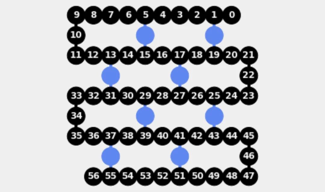 在65个量子比特的芯片中(黑色的)57个量子比特被用来模拟DTC。| 图片来源:Science Advance