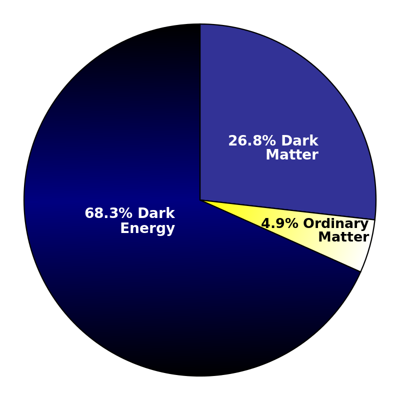 今天宇宙中所有内容物占比示意图,其中68.3%为暗能量,26.8%为暗物质,仅有4.9%为已知的普通物质。(图片来源:[url=http://commons.wikimedia.org/wiki/FileMPie_2013.svg#/media/FileMPie_2013.svg]Szczureq/Wikipedia[/url]