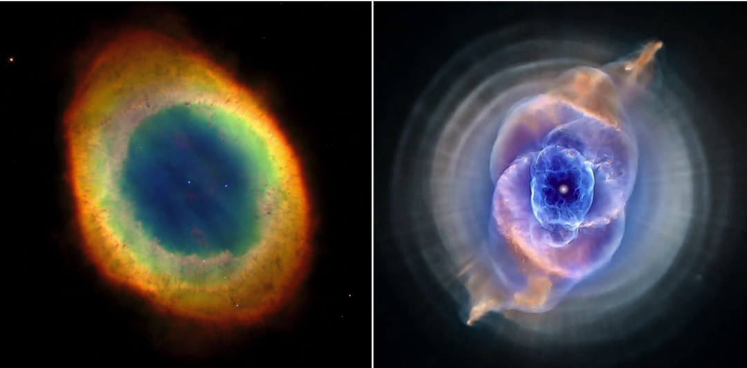 图4 行星状星云(左:指环星云;右:猫眼星云)--恒星死亡前的精彩亮相,死亡后漂亮的”寿衣”(NASA)