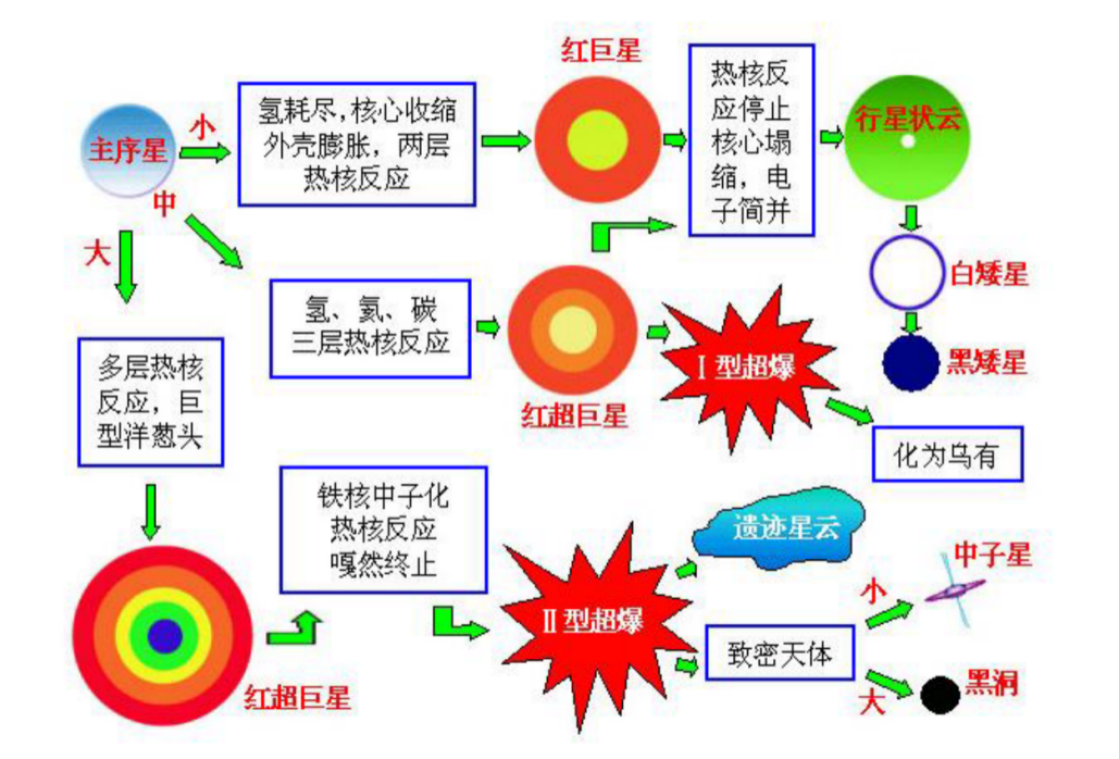 下面我们按照小、中、大三种质量类型来简要概述恒星的演化和最终结局(如图2所示):