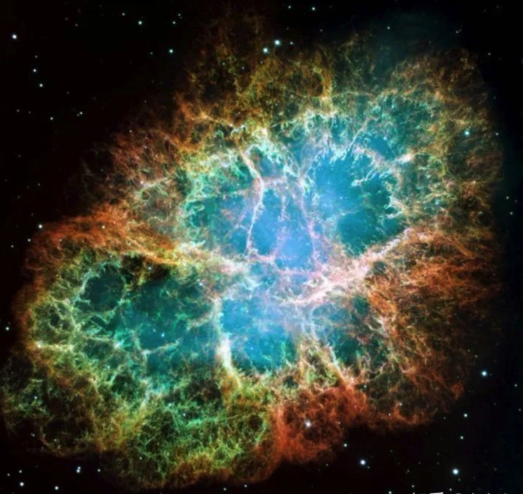 图7. 距地球约6500光年的“蟹状星云”[HST,NASA],它是公元1054年一颗明亮超新星遗迹。我国北宋的天文学家在《宋会要》中清晰地记录了这颗大质量恒星死亡引发的超新星爆发,经过近千年的演化,依然可以看到这颗恒星死亡后的壮观景象。1968年,人们首次在射电波段观察到其中正高速旋转的中子星(即脉冲星)
