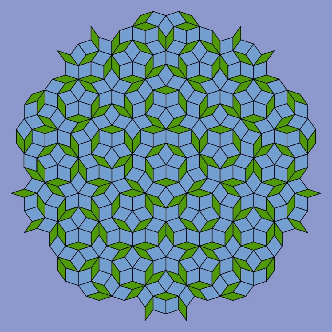 典型的晶体有一种规则且重复的结构,就像蜂巢中的六边形。准晶仍然具有秩序,但它的图案从不重复。彭罗斯铺砌就是其中的一个例子。