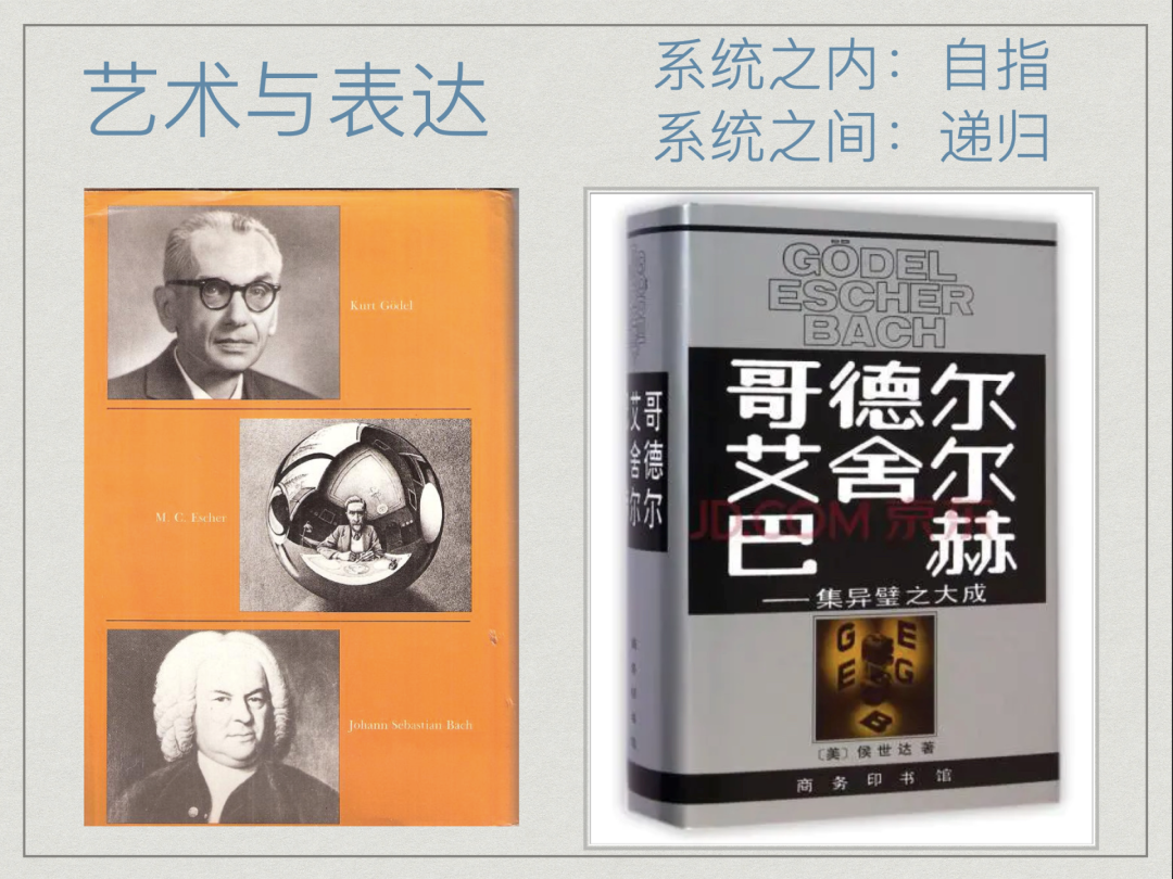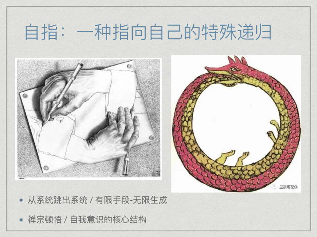 认知科学家侯世达在《哥德尔、埃舍尔、巴赫:集异璧之大成》一书中,指出了一种横跨数学、绘画、音乐,甚至人类一切领域的「怪圈」现象:自指(Self-reference),以及更广义的递归(Recursion)。