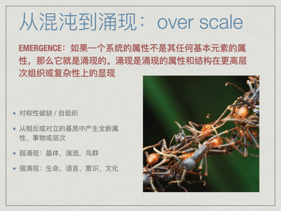 从对称性破缺产生多样性的要素或主体,到要素或主体之间进行自组织,产生自组织临界和混沌边缘,如果整个系统是一个多层级系统,那么就有可能产生原有观察尺度之外全新的系统属性或系统层级,这种现象即被称为涌现(emergence)。