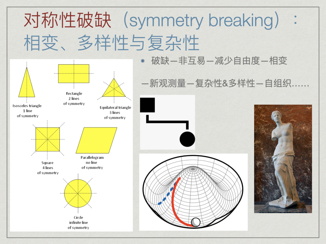 原本处在阔边草帽圆顶、保持对称性的球(粒子)——这意味着高能激发态的粒子是出于真实的物理环境中,会不断地被噪声踢向底部一种纵向自由度的低能激发态,从而打破原有的整体对称性。这时粒子就不能往所有可能方向运动了。对称性破缺的结果是降低了事物的自由度:我们还可以用一个立着的棍子来说明,如果这根棍子是圆柱体,那么它就可能往所有方向倒下,但如果横截面破缺为正方体,那就只有4个方向可能了。 虽然如此,对称性破缺却造就了事物极大的丰富性和复杂性,甚至某种意义上如此纷繁复杂的世界就是对称性破缺的结果。因此,如果说对称性代表着一种古典永恒的美的话,那么对称性破缺本身也代表着一种打破常规、多样性和异质性的美。正如有人认为断臂的维纳斯更美一样,或者相对肃穆庄严的古希腊雕塑更欣赏拉奥孔那样凌乱冲突动态的美。