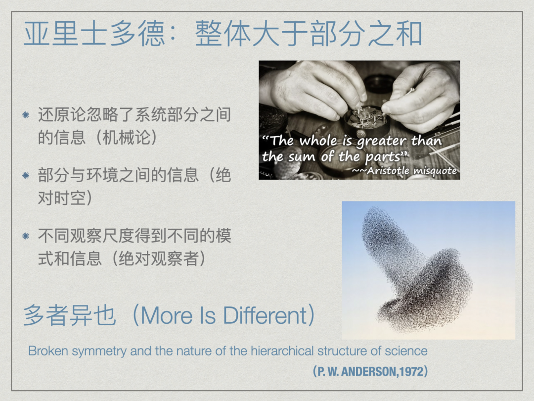 此外,对称性破缺、自组织和涌现也是复杂系统三个非常核心的概念,正如前面所说还原论三种谬误一样,他们概括了复杂性和复杂系统分别从空间、时间和尺度生成的三种方式(注意,真实系统往往是三者兼备的,只是会选取一种更适当的刻画方式)。 复杂性与复杂系统诞生的三种方式: 对称性破缺——over 空间(space) 自组织——over 时间 (time) - 涌现——over 尺度/规模(scale)