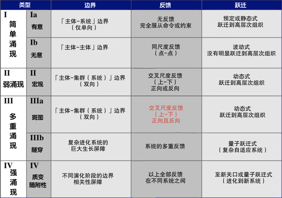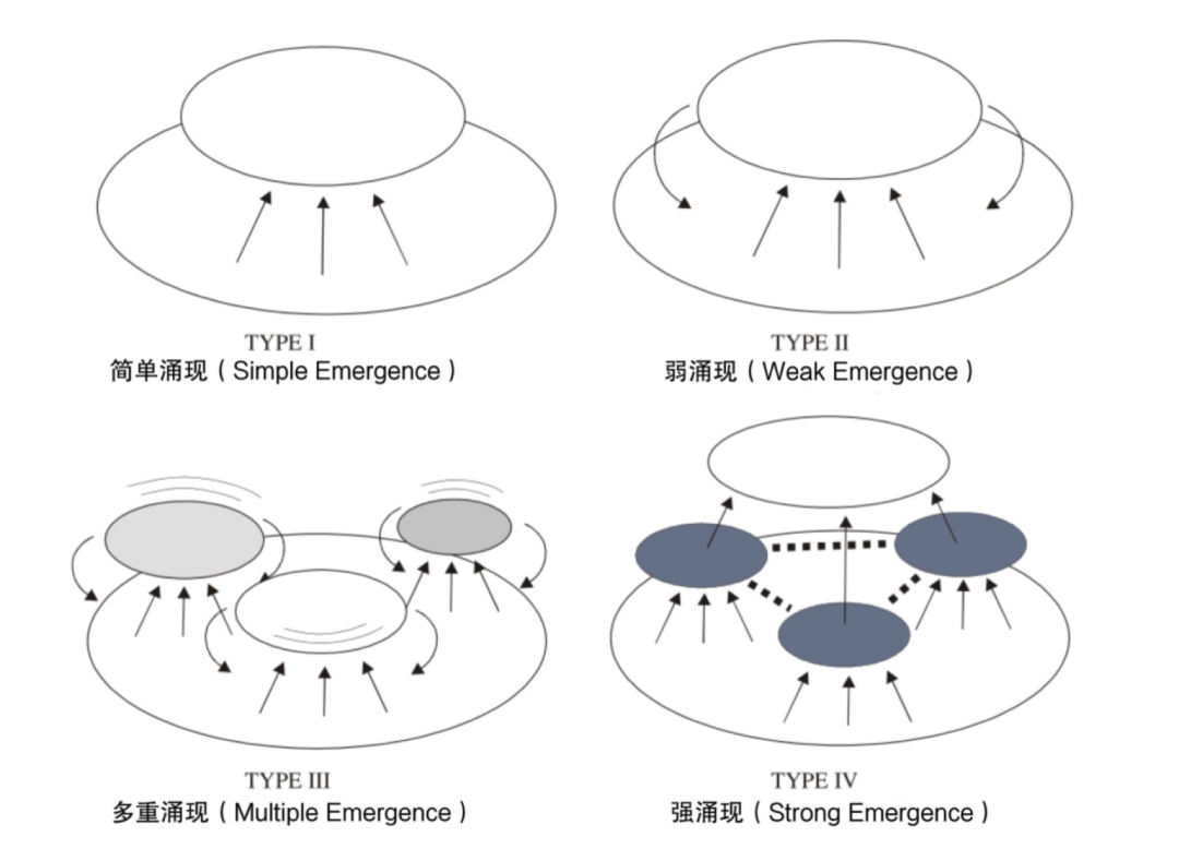 典型涌现是多重涌现或强涌现,因此只有在这两种涌现中,我们才会从新的尺度观察到全新的现象,以及不同层级交互反馈的因果作用。例如心智的诞生不会被还原为无数大规模粒子之间或细胞之间的相互作用。涌现分类如下图所示。可以看到,对称性破缺和自组织也能包括在这几种涌现中。
