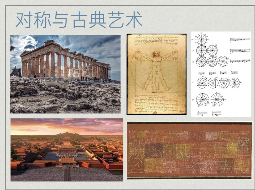 因此在古典艺术中,往往多追求对称,或以之为美,或以之为表现手法,例如前者古希腊的帕特农神庙和中国的故宫,后者巴赫的对位法,以及当代艺术中对对称性纹样和花纹的把玩。