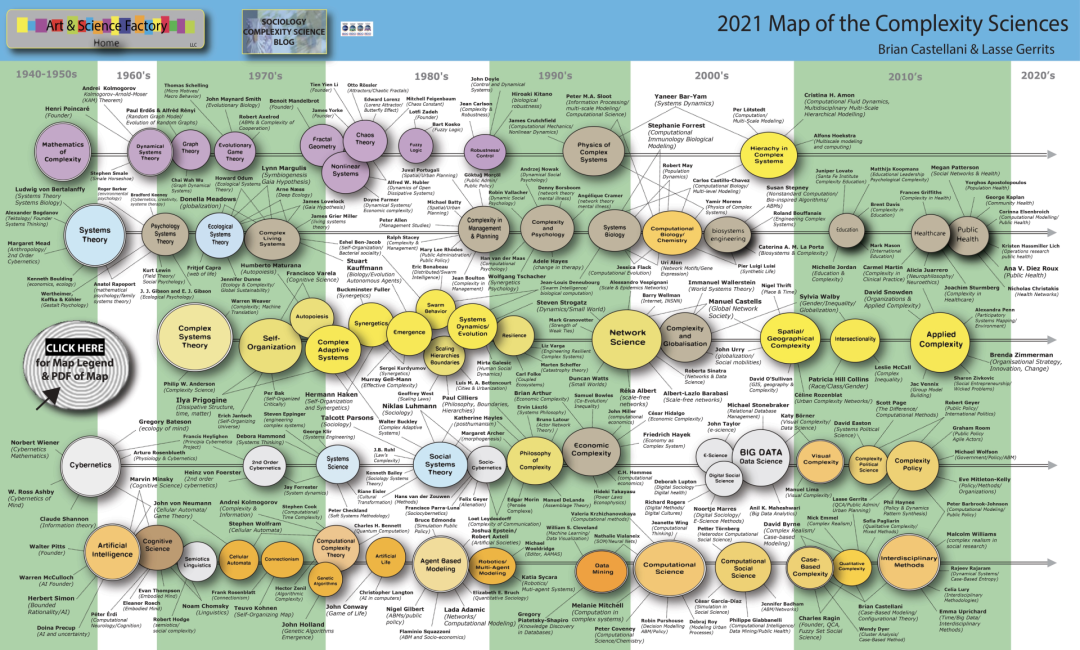 5. 大数据时代与复杂系统的物理学(2010~):大数据时代,数据驱动而非仅仅计算模拟。数学方程描述统一规律。生物学的 Kleiber 定律、规模理论(Scale, Geoffrey West, 2017) 下图是一张比较详细的复杂性科学发展史。在这其中,数学中的混沌理论起到了关键作用,混沌系统在某种意义上就是复杂系统的代名词。