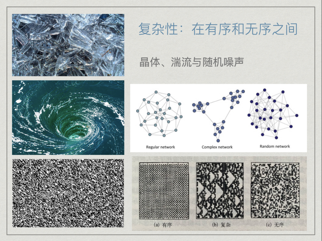 那么,究竟什么是复杂性和复杂系统?复杂科学又是如何诞生的? 复杂性与复杂系统 复杂性(Complexity) 本身就是一个「复杂」的概念。在复杂性科学中,有「要想理解复杂,先要理解复杂」的说法。不过,我们依然可以从秩序的角度来认识它:复杂是一种处于完全有序和完全无序之间的状态。如下图左边,在无序的随机噪声和有序的晶体之间,湍流就是一类具有很高复杂性的现象。复杂网络作为复杂系统的骨架,也介于基于方程生成的规则网络和随机的网络之间,例如社会网络、生态网络等,这些具有幂律特征的网络,都是在真实世界中自然形成、也往往对人类更有意义的网络。