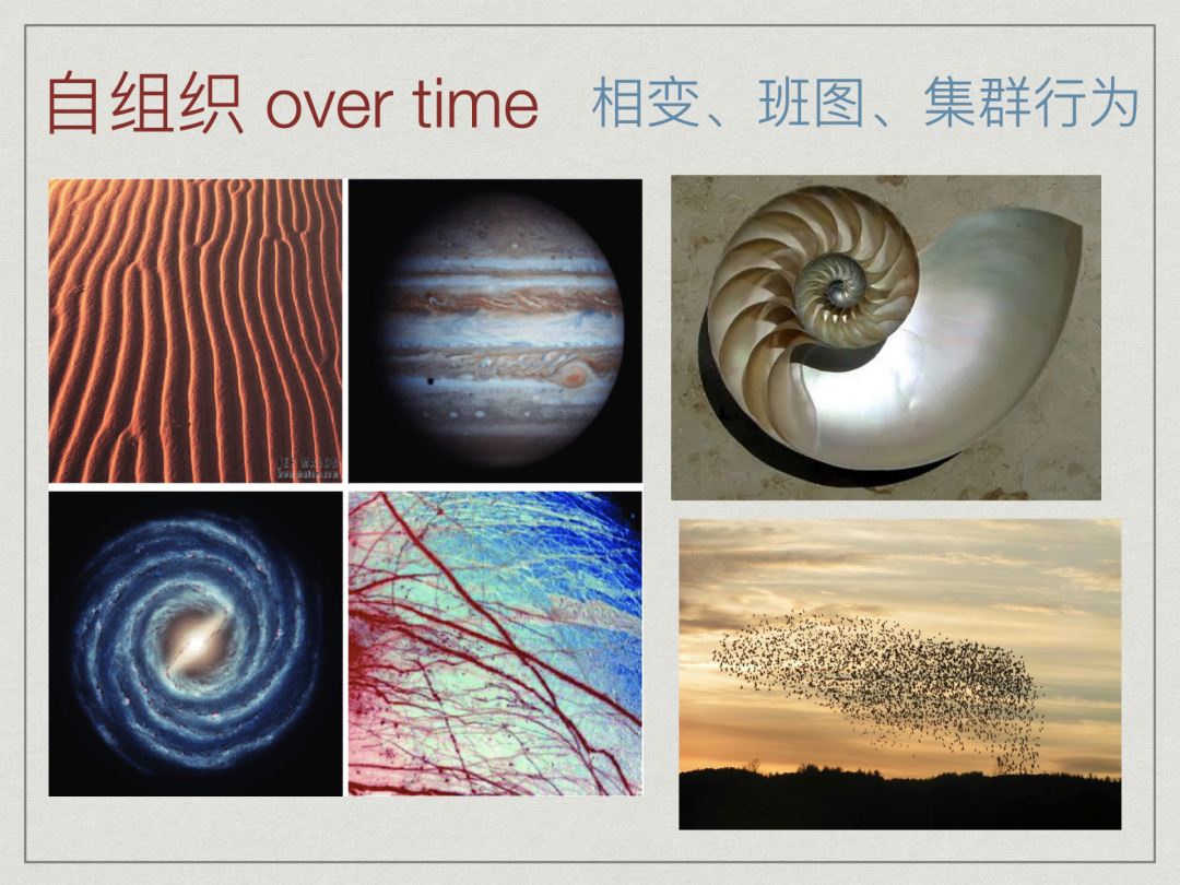 当有足够的能量可用时,该过程可以是自发的,不需要任何外部主体agent进行控制。它通常是由看似随机的波动触发,并由正反馈放大。最终形成的自组织是完全分散的,分布在系统的所有组件中。因此,自组织通常是健壮的,能够生存下来或者自我修复严重的干扰。 如下图所示,在物理、化学、生物、神经等各种领域,各种斑图和集群行为,都是自组织的产物。
