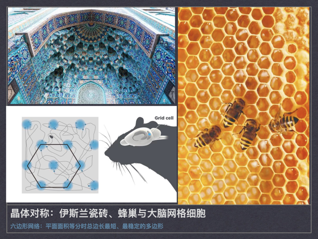 在自然界中,形式对称性的生成,源自受到作用力的大小和方向始终一致。例如在二维情况下的雪花、花朵或水池中的波纹,三维空间中的球形。然此自然之大美却并非以美为美,而是一种实在的效用。正如牛顿所说,「绝不浪费一丝一毫」。这其中最典型的例子就是蜂巢的六边形网络,它是在把平面划分为很多面积相等的部分时,边界网所具有的总长度是最短的图形(当一个图形是圆形时周长最短)。可以说,无论是蜜蜂,大脑中的网格细胞,还是以装饰艺术为主的伊斯兰瓷砖和地毯,都有意无意在采用晶体对称对自然本身致敬。